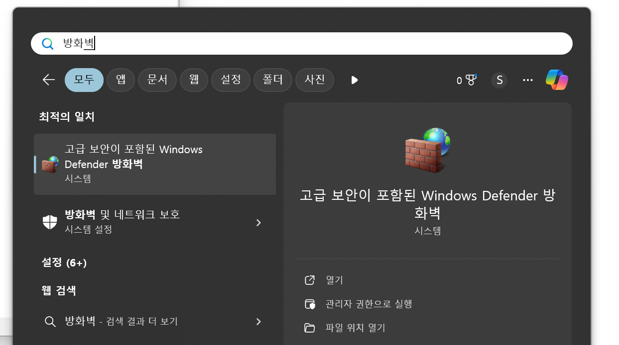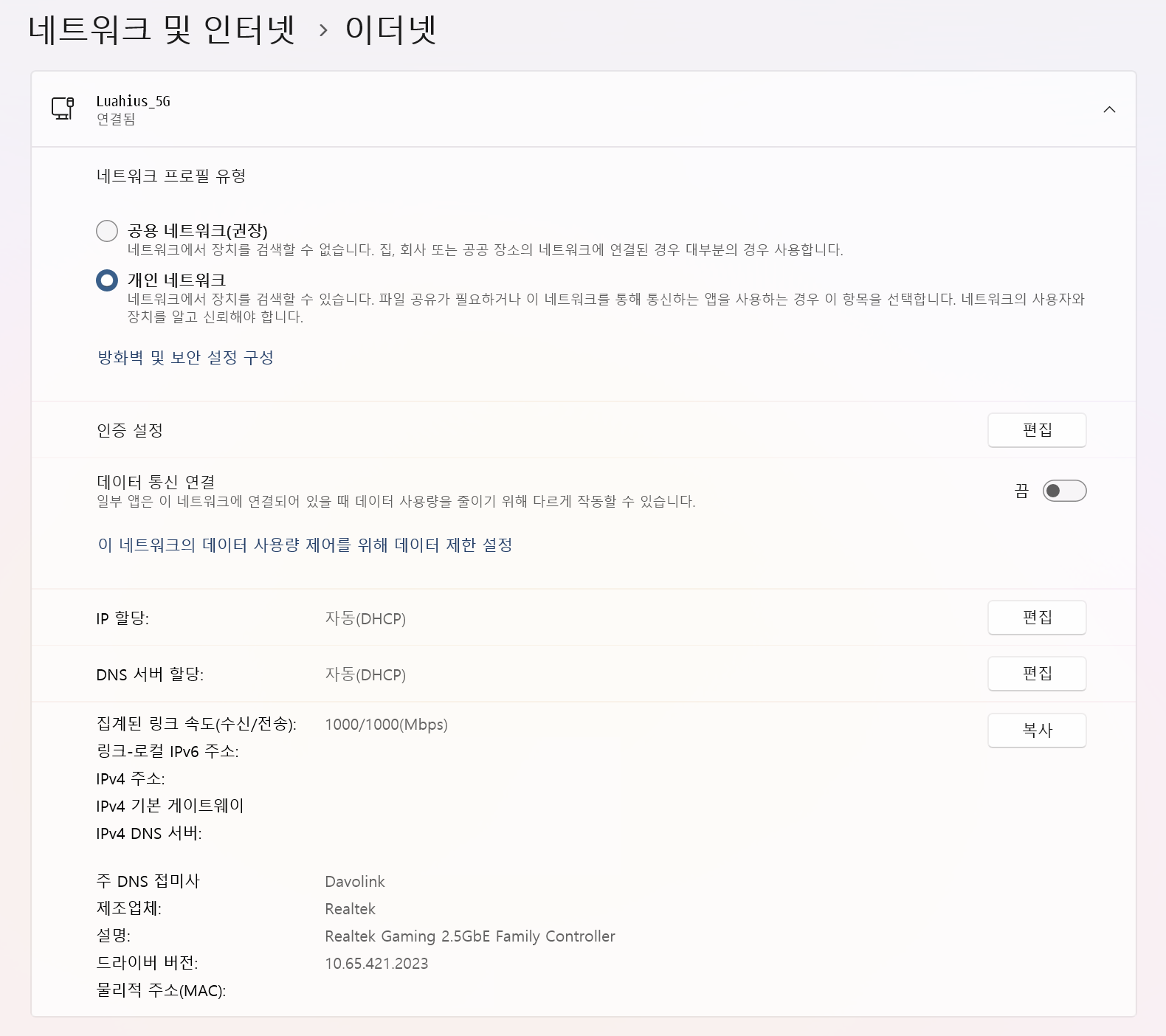설정 → 네트워크 및 인터넷 → Wi-Fi 또는 이더넷 → 속성 → 네트워크 프로필: 개인 으로 설정되어 있는지 확인