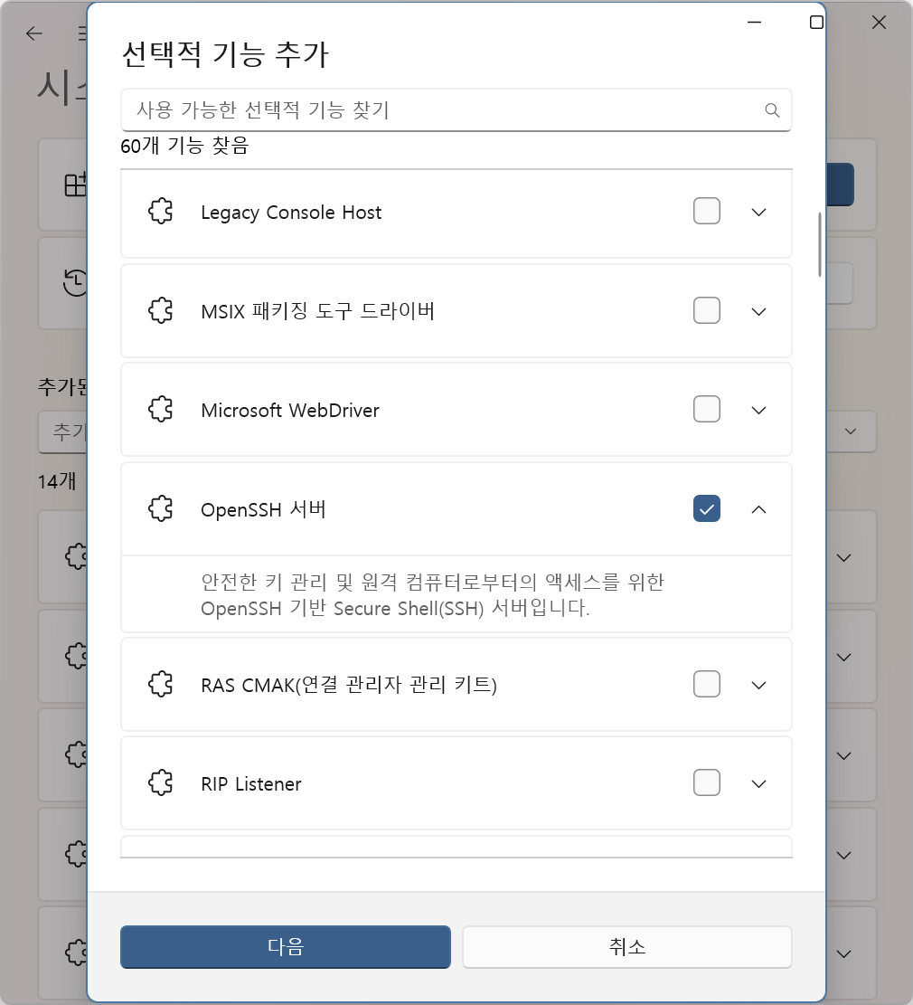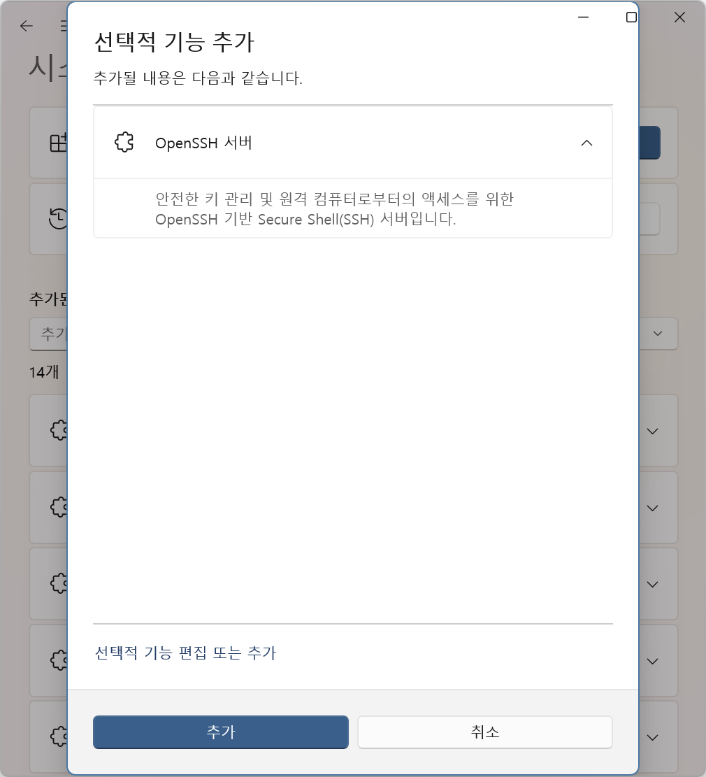 경로: 설정 → 앱 → 선택적 기능 → 선택적 기능 추가 → OpenSSH 서버