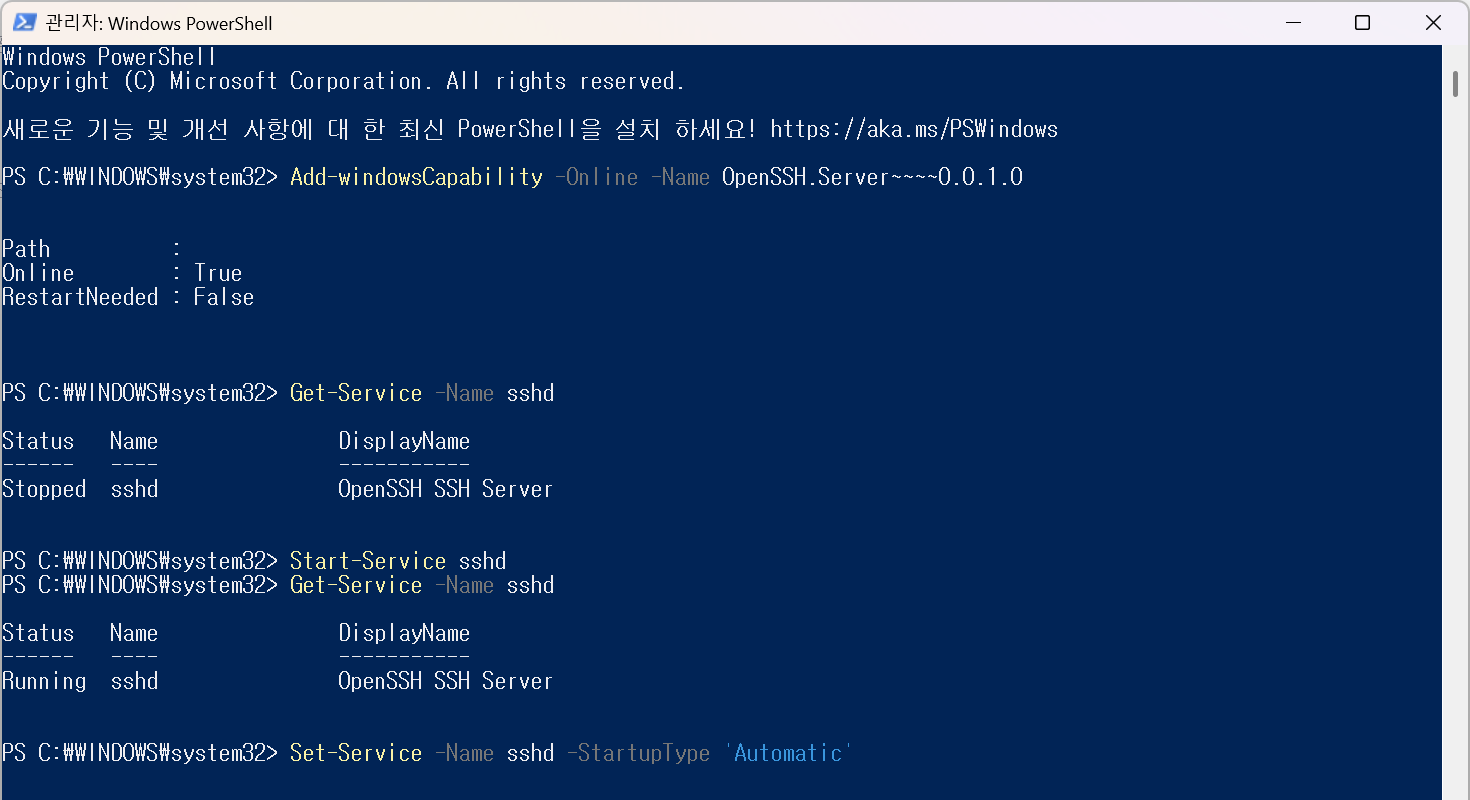 수동 실행 설정 | Set-Service -Name sshd -StartupType 'Manual' |