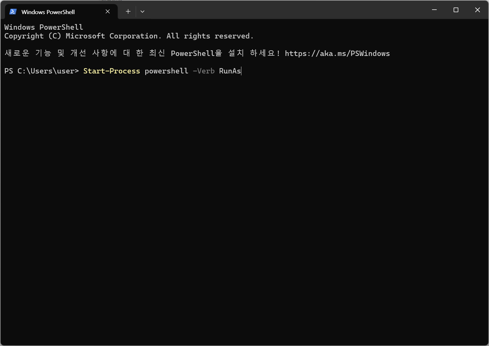 - Win + R → powershell 입력 → Ctrl + Shift + Enter